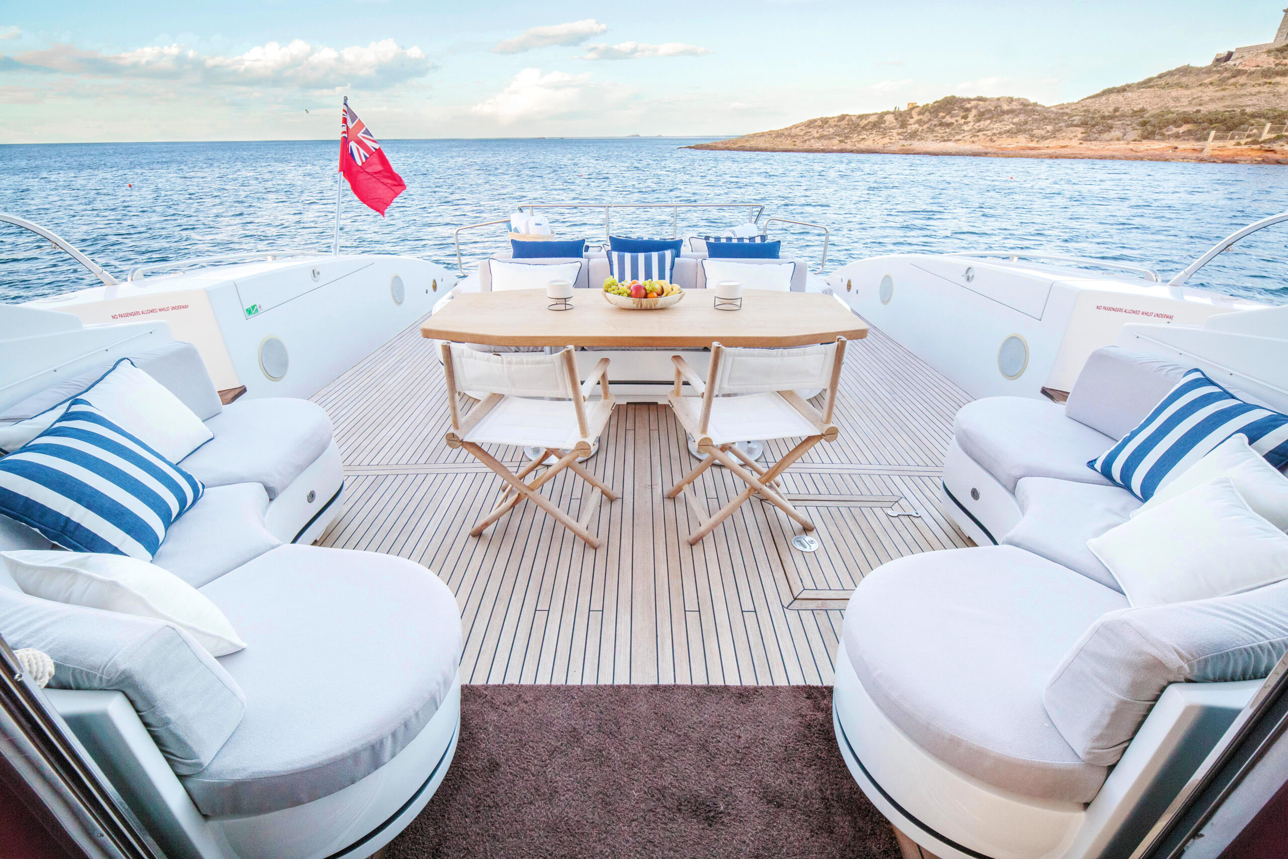 Outside, there is a custom-made table at the stern that can comfortably accommodate eight diners, spacious sundecks at the bow and stern, and a third area located on top of the roof where guests can sunbathe in absolute privacy.