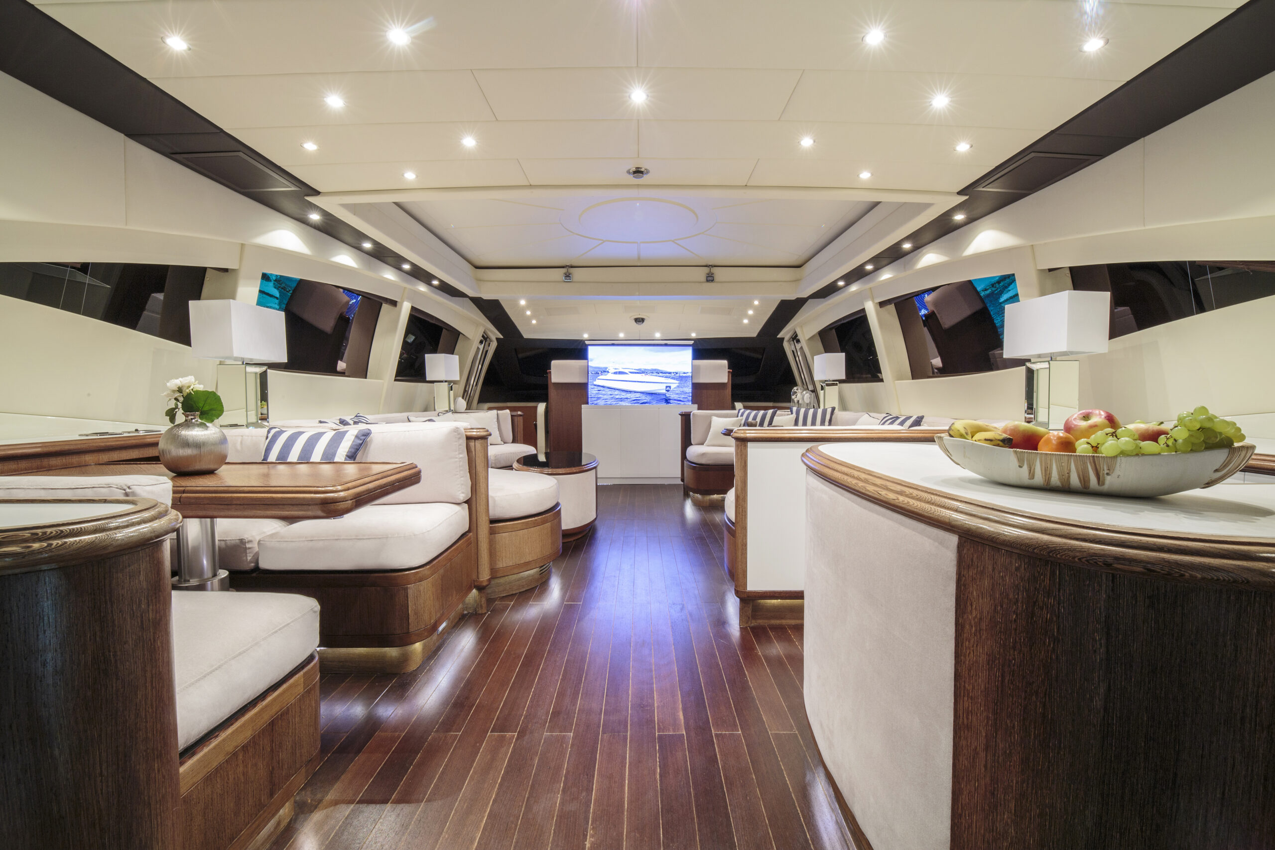 tables that can be transformed into a large dining table. On the opposite side, due port, an area with large sofas and a low table with two beanbag chairs is the ideal spot to relax and watch TV, or to chat with friends. By the entrance are two sofas facing each other and a table that has a backgammon board inside of it. This is the ideal place to play tabletop games, or to catch up on emails with views of the sea. Opposite this table there is a handy bar where delicious cocktails and aperitifs will be prepared for you. In addition, half of the saloon’s roof can be opened, letting natural light fill the entire space.