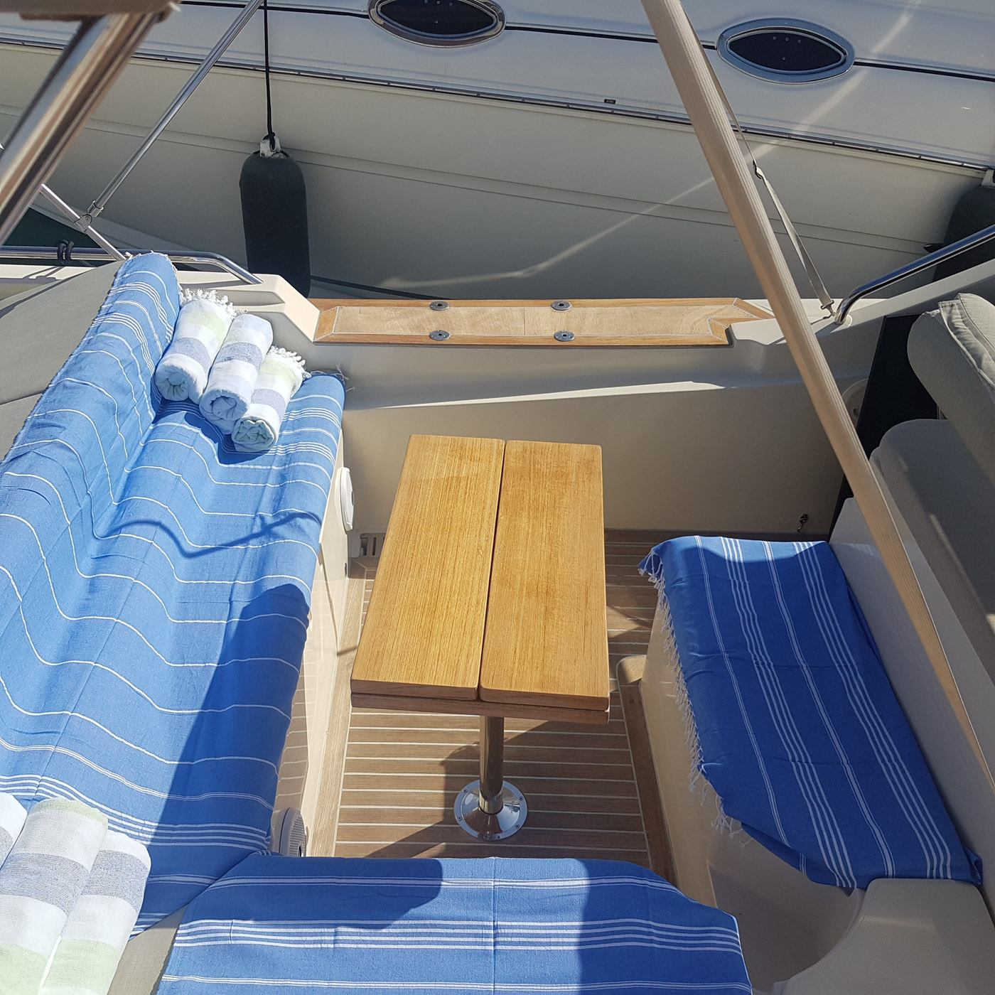 Teak table in cockpit seats