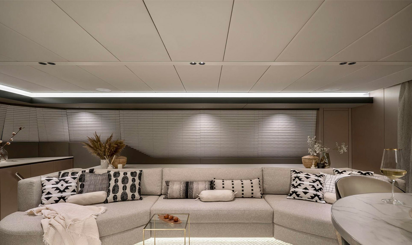 The area of the Flybridge and bar relaxing area is large and has 50 m². You can enjoy the sun in the front relaxing seating and sun areas entertained by Fantastic HiFi Sonos Bowers&Wilkins.